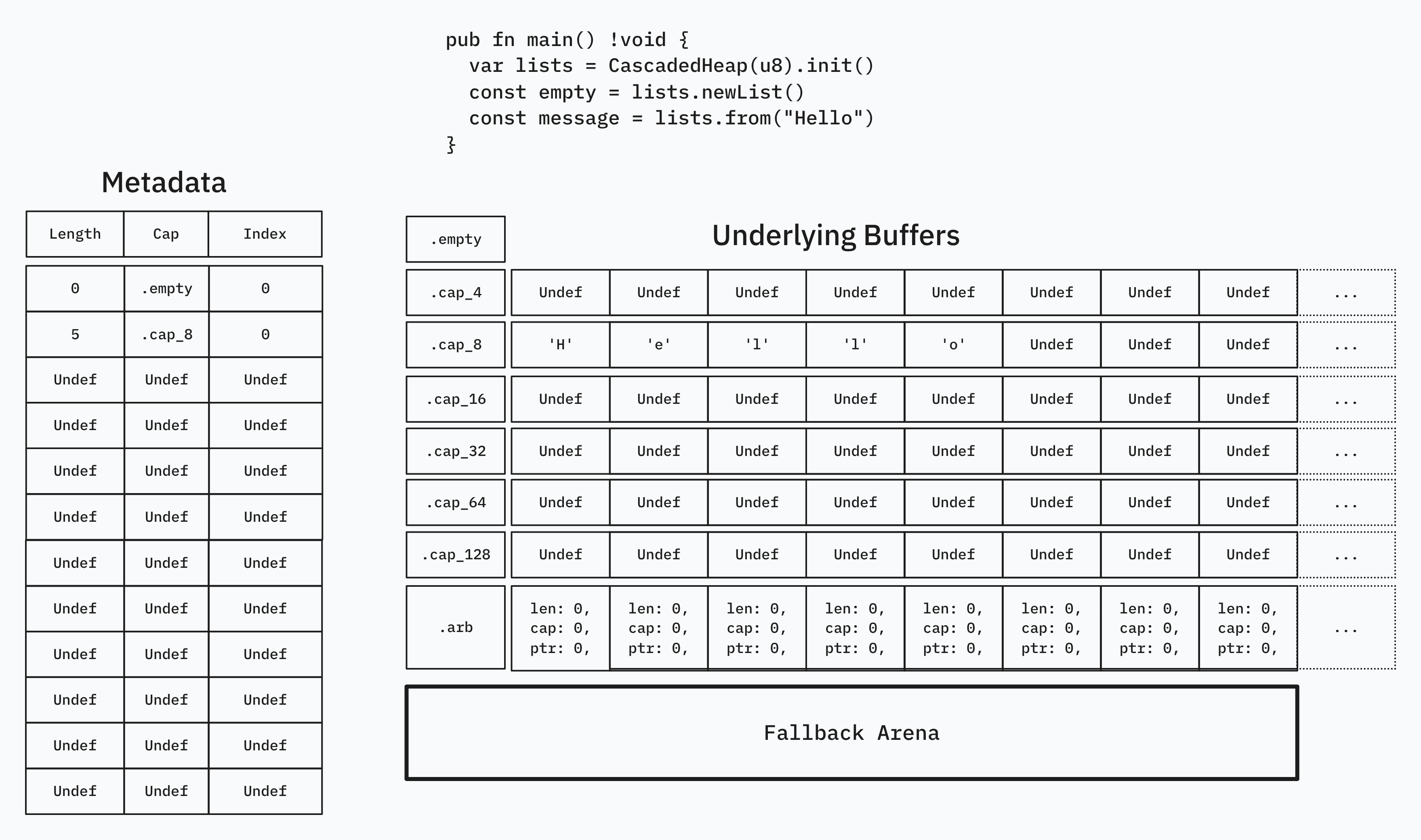 But how do we tell which buffer our data is in? Our metadata from earlier only held an index to the underlying buffer, but now we also need to store a length and a capacity. Reallocations amount to a new_bucket.appendSlice(items) and a @memmove(items, last_items) to fill in the newly duplicated items, to be followed by an old_bucket.items.len -= capacity.
